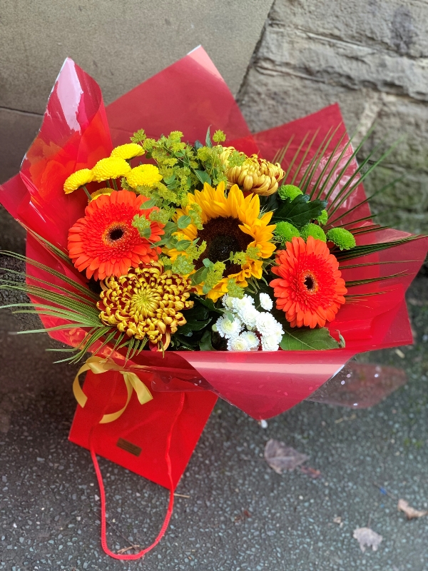 A rich and vibrant expression of the wonderful autumn season. Beautiful sunflowers, gerberas and chrysanthemums all displayed in a hand-tied bag with water.